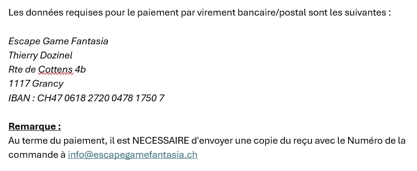 - Le payement de l'activité doit se faire dans les 72h heures après votre réservation. Soit par virement bancaire ou par Twint.